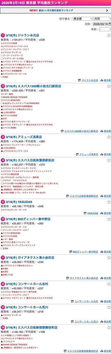 投稿本文: 3/19 出玉ランキング(🗼東京/🏙️神奈川)