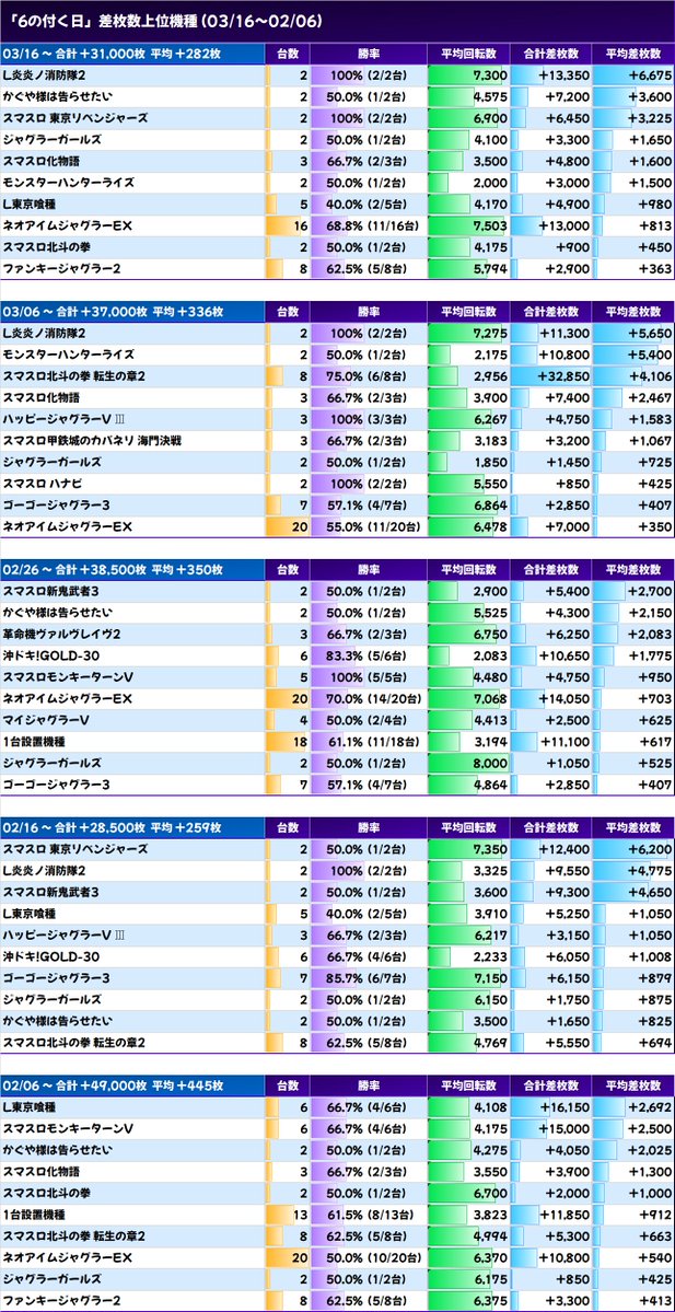 03/06 合計 +37,000枚 平均 +336枚(51/110台)