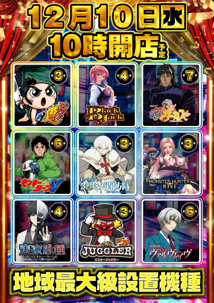 投稿本文: こんばんは‼新!ガーデン桶川店です🐯⚡明日⚡12月10日(水)⚡新装開店⚡最新機種🎰スロット・Lスマスロ化物語・Lプリズムナナ・SネオアイムジャグラーEX・e地獄少女7500Ver.・e北斗の拳11暴凶星朝の抽選は9:40から🍃明日も朝からのご来店お待ちしております🐈 さらに表示