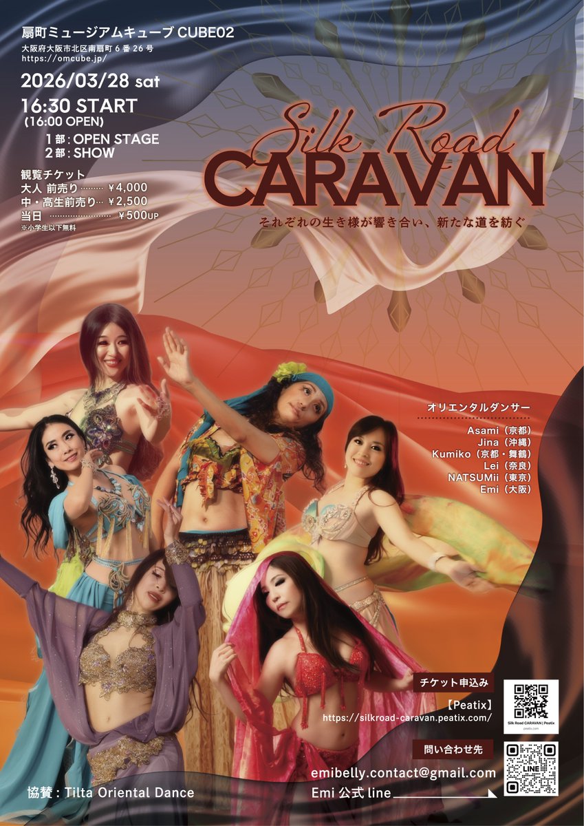 『Silk Road CARAVAN(シルクロード・キャラバン)』チラシデザインを担当しました。公演は、2026年3月28日(土)扇町ミュージックキューブCUBE02です。