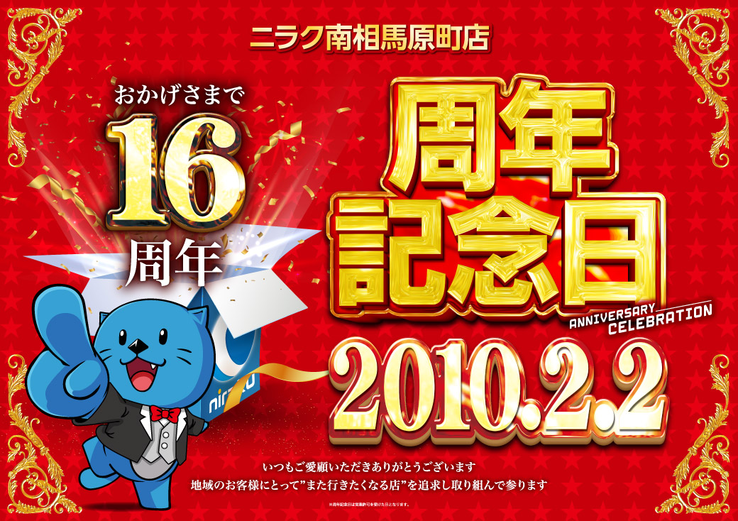 投稿本文: 🎉🎊明日、16周年を迎えます🎊🎉日頃よりニラク南相馬原町店をご愛顧いただき、心より感謝申し上げます。皆さまに支えられ迎える16周年。感謝の想いを胸に、周年記念日を全力でお迎えします!✨皆さまにとって良い一日になりますように✨#2月2日 #ニラク南相馬 #周年 さらに表示