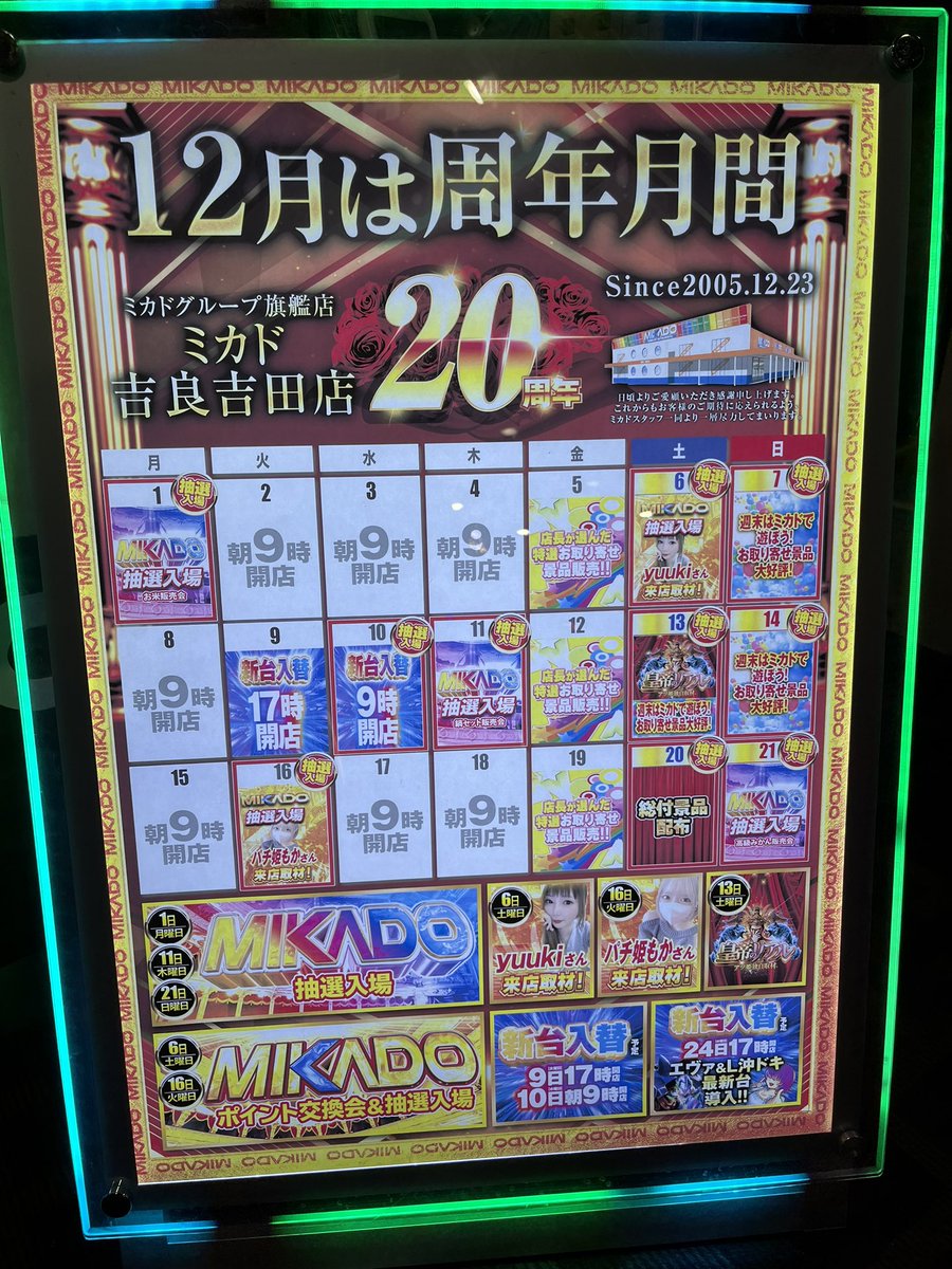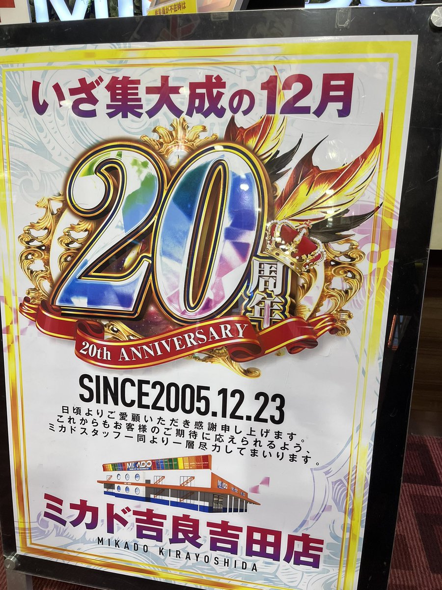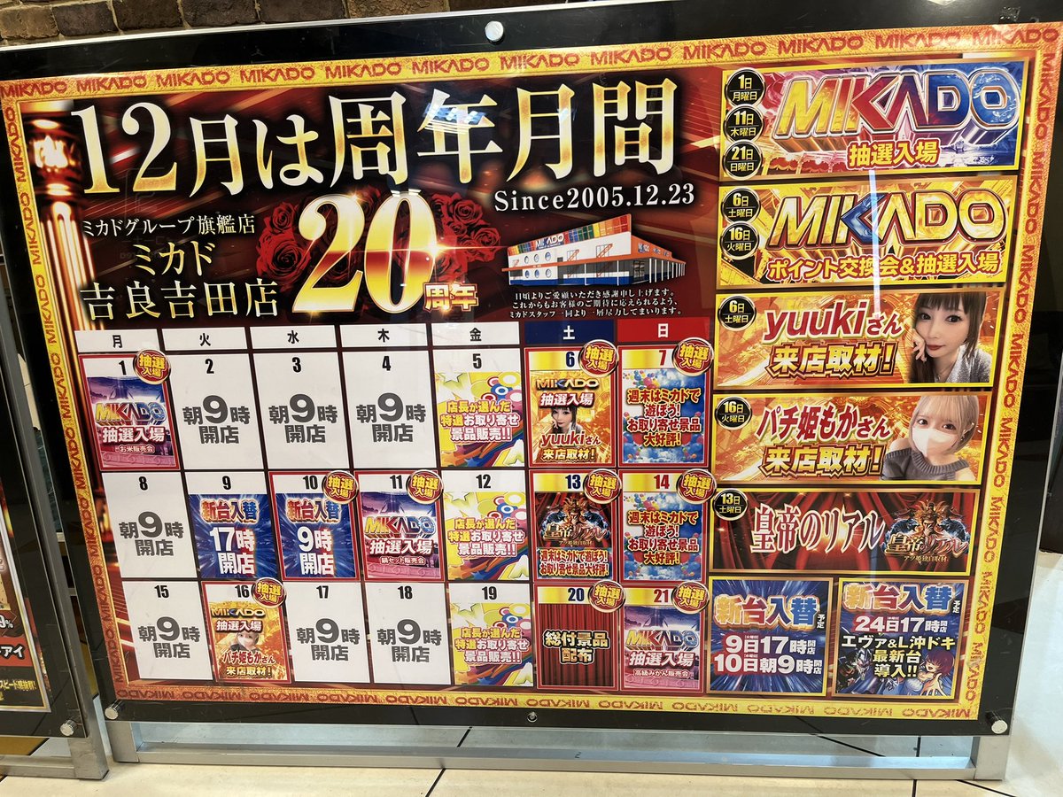投稿本文: 【ミカド吉良吉田店様】✅️12/9 新台入替/17時OPEN✅️12/10 新台入替/9時OPEN/抽選入場✅️12/11 抽選入場/鍋セット販売会✅️12/13 皇帝のリアル/お取り寄せ景品大好評✅️12/16 パチ嬢もかさん来店予定✅️12/20 総付景品配布✅️12/23 ㊗️ミカド吉良吉田店様20周年㊗️✅️12/24 さらに表示