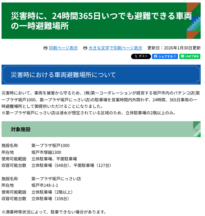 (株)第一コーポレーションが経営するパチンコ店(第一プラザ坂戸1000、第一プラザ坂戸にっさい店)の駐車場を車両の一時避難場所として御提供いただけることになりました https://twitter.com/gourmet_saitama/status/1909186468326867381