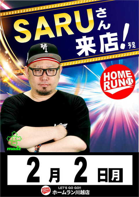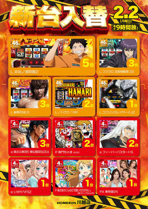 投稿本文: 🔥明日2月2日(月)🔥ホームラン川越店に...🔥【 SARU 】PR実践来店‼️🐒さらに!明日は待ちに待った✨新台入替✨朝9時OPEN予定!話題の『L炎炎ノ消防隊2』5台導入をはじめ、スマスロ・パチンコ計11機種が仲間入り!おすすめの東京喰種やヴヴヴ2も見逃せないっ💪 さらに表示