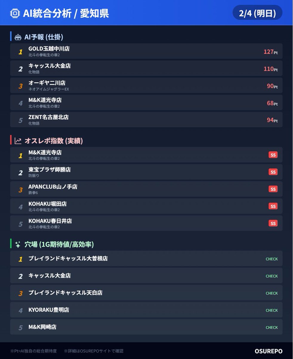 投稿本文: 【2/4(明日) 愛知県 スロット】優良店/AI予想&実績まとめ📊🤖AI予報/仕掛け1. GOLD玉越中川店2. キャッスル大金店3. オーギヤ二川店4. M&K道光寺店5. ZENT名古屋北店📈オスレポ指数/実績1. M&K道光寺店2. 東宝プラザ師勝店3. APANCLUB山ノ手店4. KOHAKU堀田店5. KOHAKU春日井店 さらに表示