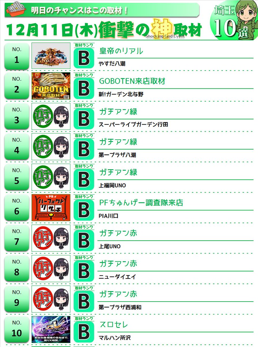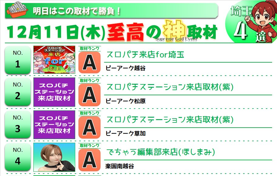 投稿本文: 12月11日(木)~埼玉🌳👑明日の神取材👑☀️Aランク🔸スロパチ来店for埼玉 ピーアーク越谷🔸スロパチステーション来店取材(紫) ピーアーク松原 ピーアーク草加🔸でちゃう編集部来店(ほしまみ) 楽園南越谷☁️Bランク🔸皇帝のリアル やすだ八潮🔸GOBOTEN来店取材 新!ガーデン北与野 さらに表示
