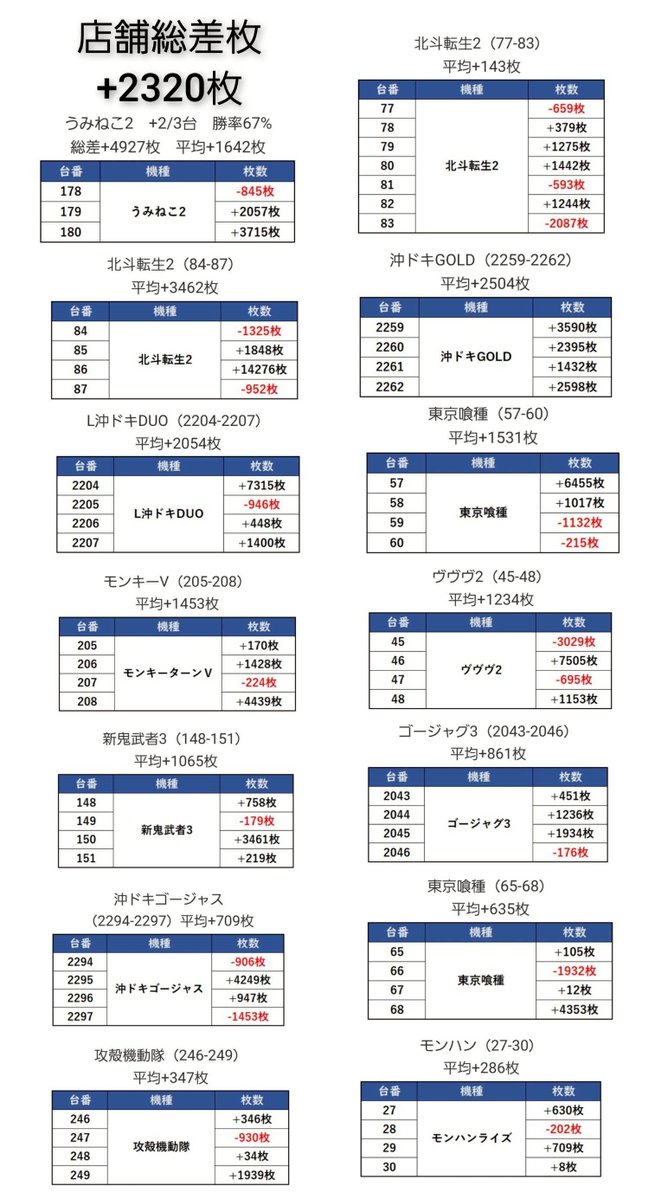 店舗総差枚+2320枚