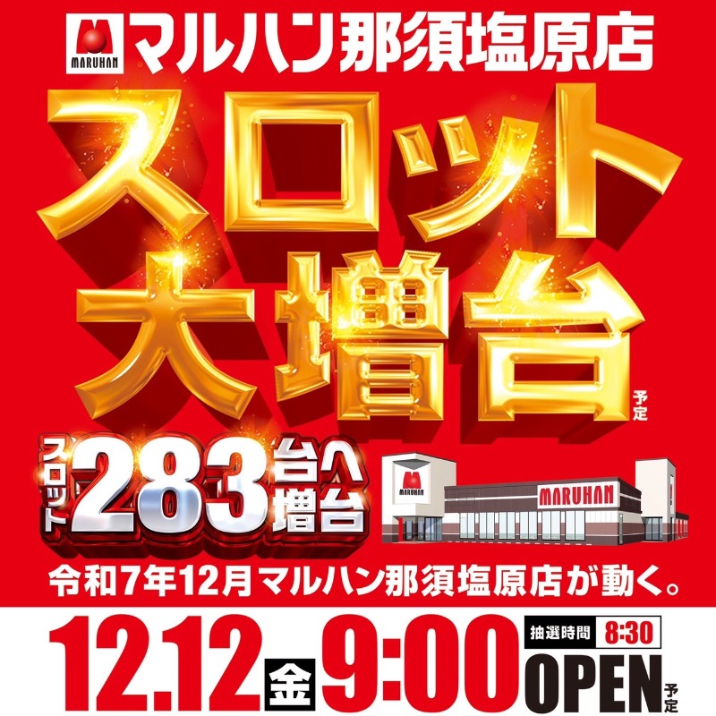 投稿本文: 🔴マルハン那須塩原店12月12日(金)スロット大増台!!!9時OPEN!!!スロット設置台数283台へ!!!12月マルハンが動く!!!SINCE2005.12.2612月は周年月間!!!おかげ様で20周年!!!詳細は店長Xをチェック!!!@ma_kun_maruhan さらに表示
