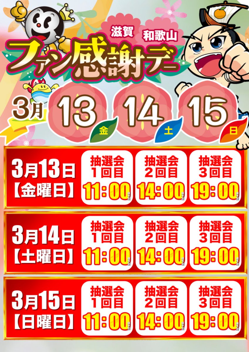 投稿本文: こんばんは! マルハン和歌山インター店です! ☆3月14日【土】☆ ~あさ10時オープン~✨豪華賞品盛沢山✨📷毎日3回抽選📷 朝の入場抽選は9時50分開始🔥ご来店お待ちしております! さらに表示