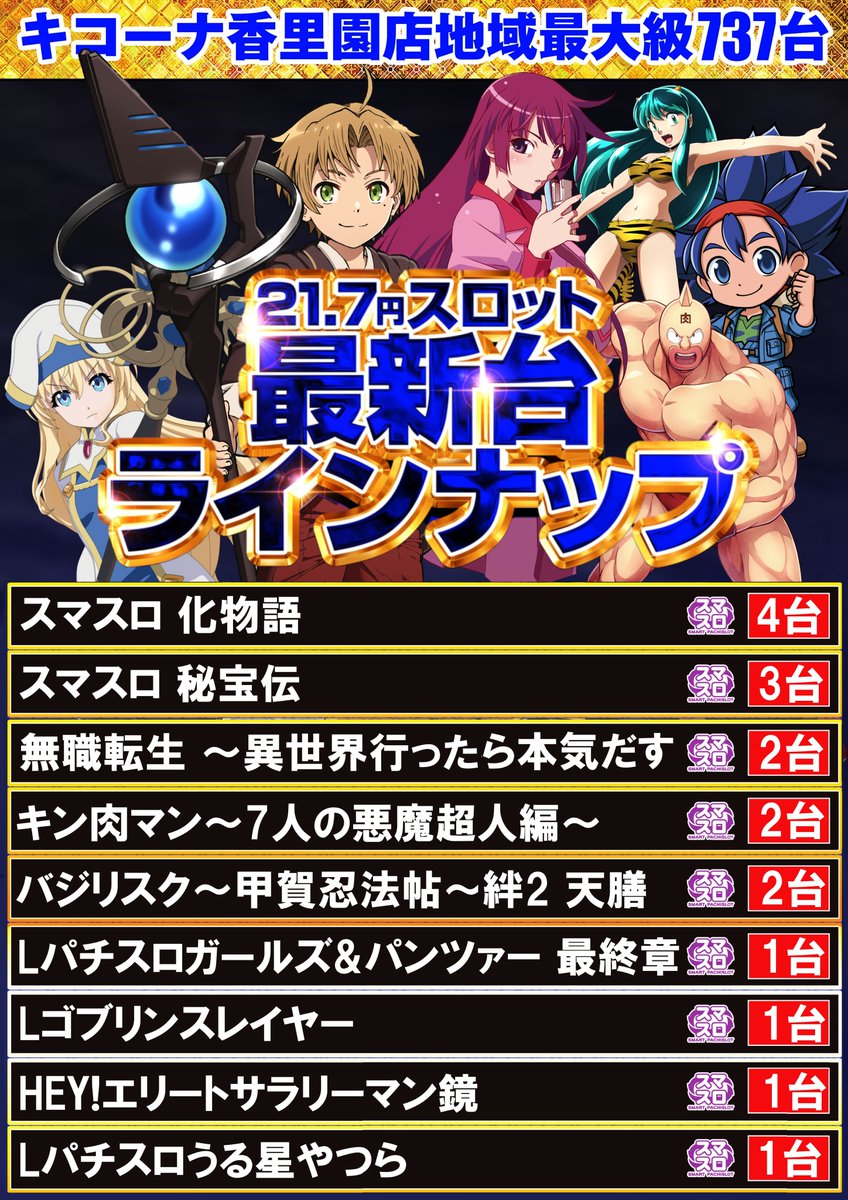 投稿本文: 明日12月10日もう2025年残り2回となる新台入替!!今回は今だからこそ打ちたい機種を多数リバイバル導入!そして2.81円スロットにスマスロ初登場!!8日稼働開始済み🆕e北斗の拳11 暴凶星🆕🆕スマスロ 化物語🆕明日も是非!キコーナ香里園店へ♪#つぶやキコーナ さらに表示