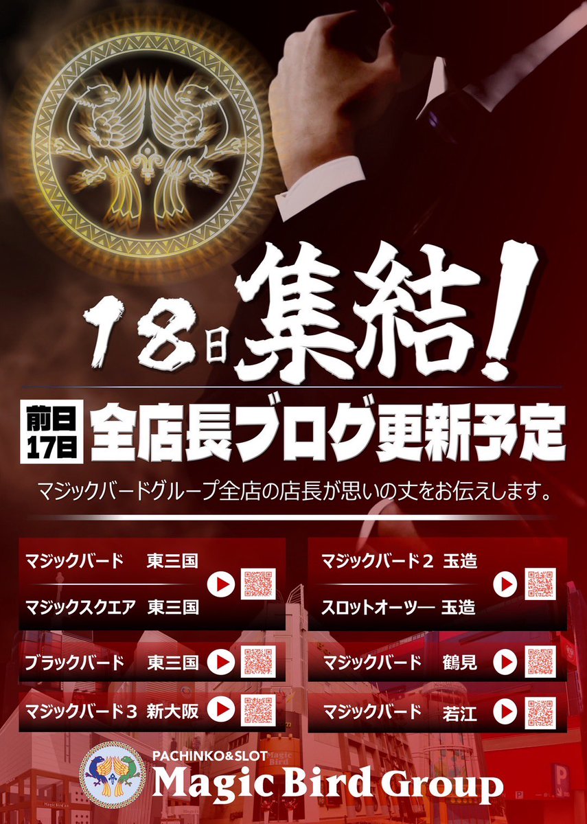 投稿本文: 03/18 特攻すべき注目グループ⚔.🦅マジックバードグループ合同.🪶マジックバード東三国🪶マジックスクエア東三国🪶ブラックバード東三国🪶マジックバード3新大阪🪶マジックバード2玉造🪶スロットオーツー玉造🪶マジックバード若江🪶マジックバード鶴見.→8の付く日特定日→ さらに表示