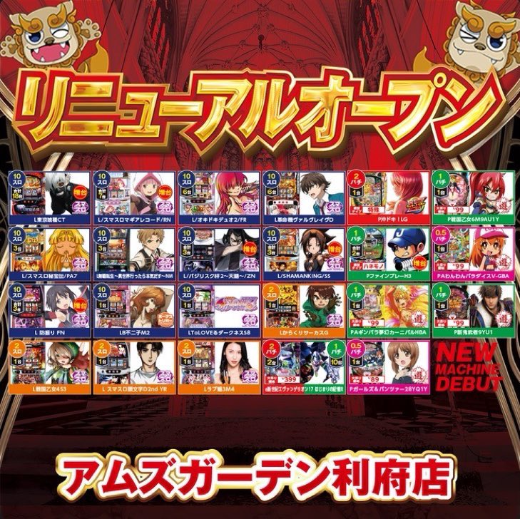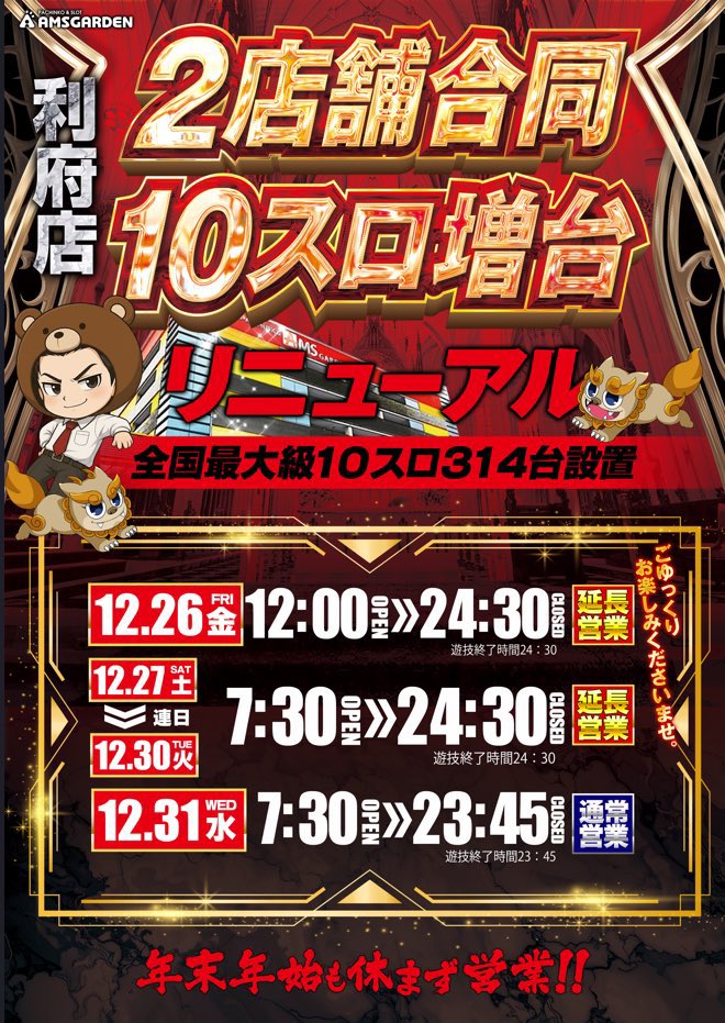 投稿本文: 明日は...!!!⭐️リニューアルを盛り上げる⭐️3️⃣日間連続来店の3️⃣日目 🐻アムズガーデン利府店様🐻に明日もお邪魔させて頂きます!!🐈⬛🐈💨💨もちろん😹猫来店😹ですにゃー!!利府店様&古川店様 2店舗合同 10スロ増台リニューアル オープン 3日目っっ!! さらに表示