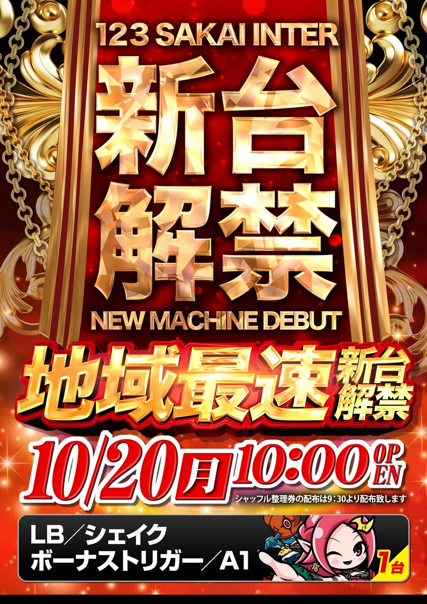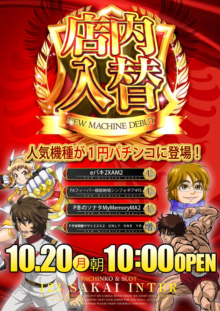 投稿本文: こんばんは!123堺インター店でっす☺️明日10月20日(月)は??\\\最新台解禁&店内入替///人気機種が1円パチンコに初登場♪😤入場整理券は朝9時30分より配布デス!!朝イチより多数様のご来店お待ちしてまーす😊#パチンコ #スロット #店内入替 さらに表示