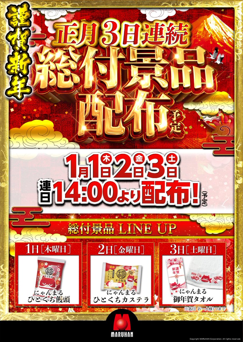 投稿本文: 今年もあと少しですね。来年は今年以上に愛される店舗づくりにスタッフ一同努めていきます!マルハンは大晦日も23時まで営業!🐺明日のご案内🐺2026年1月1日[木] 9時開店※入場抽選8時40分予定★総付景品★☆にゃんまるひとくち饅頭☆2026年もマルハン琴似店でお待ちしております🐺 さらに表示