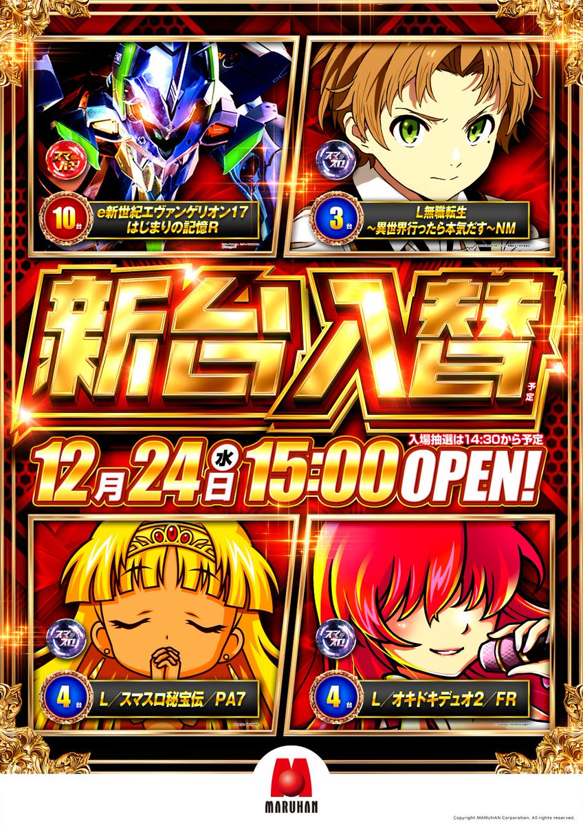 投稿本文: マルハン富山インター店です12月24日(水)新台入替予定パチンココーナー15時開店 ※14時30分抽選スロットコーナー18時開店 ※17時50分抽選話題の最新機種ゾクゾク導入予定🌹ご来店お待ちしております。 さらに表示