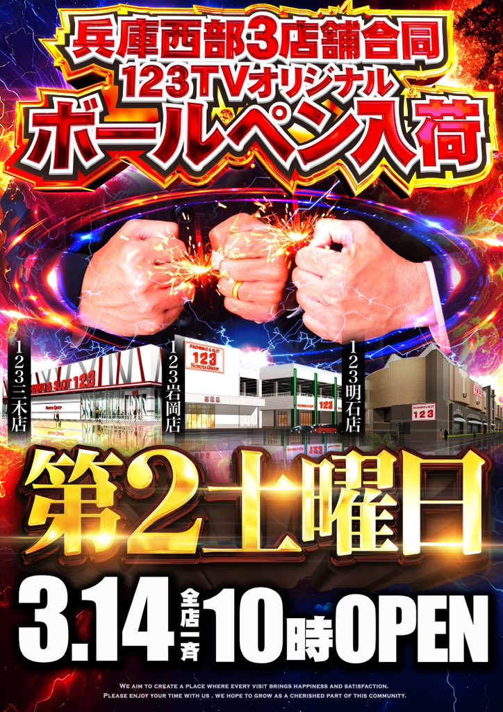 投稿本文: 🐙明日3/14まとめ🐙【土曜日】🔸AISEN【④の付く日】特にありません。【取材、来店など】🔸123岩岡→レッツ岩岡→123TVオリジナル賞品入荷(ボールペン3店舗合同入荷)🔸123三木🔸123明石→123TVオリジナル賞品入荷(ボールペン3店舗合同入荷)🔸ミクちゃんガイアアリーナ さらに表示