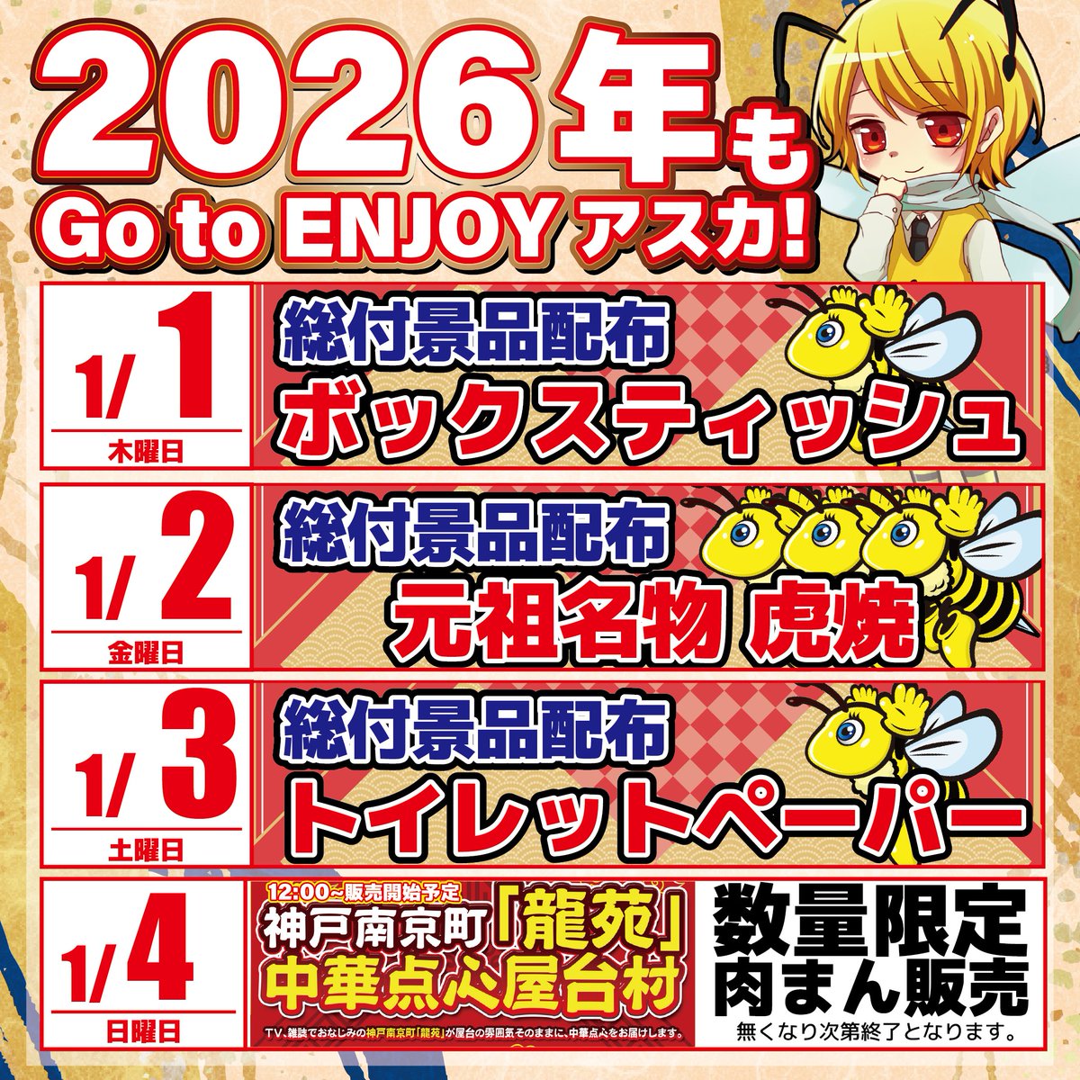 投稿本文: 1月4日 日曜日🌞10:00🕙OPEN【抽選参加券配布時間🎫】9:35~9:40〆切本日、🍥龍苑様🍥来店美味しい肉まんを販売いたします✨キッチンカー木の実様も来店🚙💨*認証マークとおさらばしましたが、アスカ薮塚店のXアカウントですのでご安心ください。#アスカ薮塚店 さらに表示
