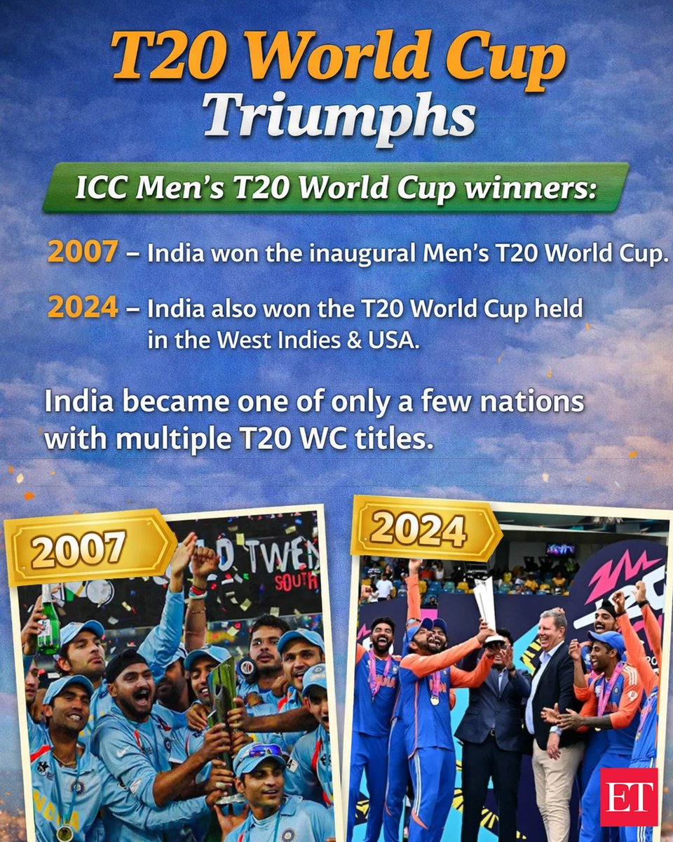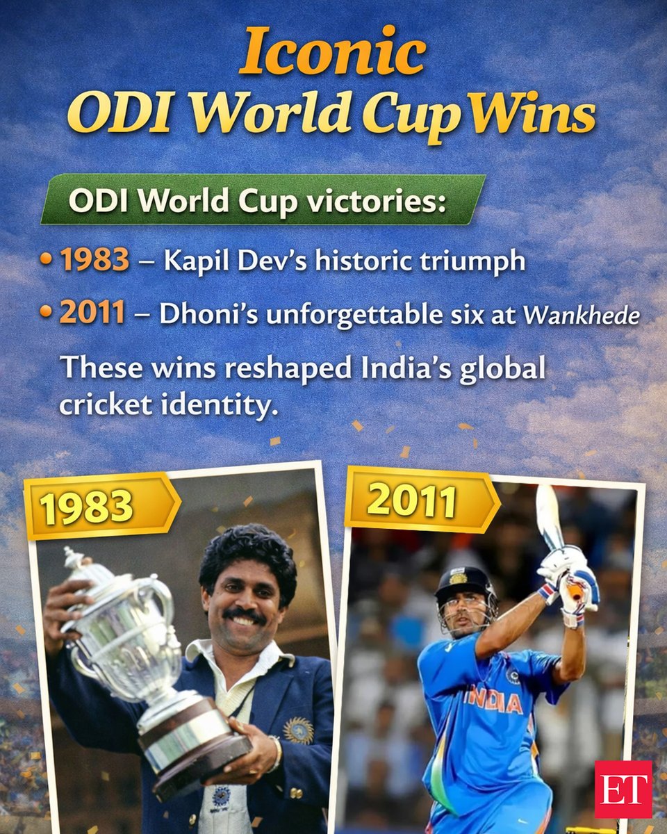 投稿本文: #ETGraphics | #India’s #cricket #history isn’t just about runs & #records — it’s about unforgettable #moments, #iconic wins, and a #legacy that spans formats and generations. Swipe through India’s #ICC trophy journey and gear up for the 2026 Men’s T20 #WorldCup! さらに表示