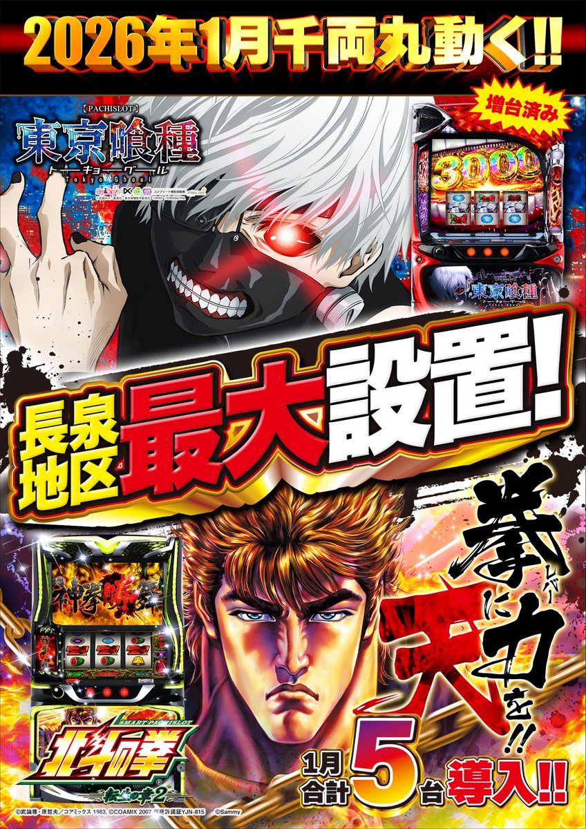 投稿本文: 明日1月30日(金)9:00オープン‼️長泉千両丸のマスコットキャラクター😎マルちゃん登場😎そして16時頃より、お米の出張販売もあります🍚🍙長泉地区最大設置‼️スマスロ✨北斗の拳 転生の章2✨🤬東京喰種🤬絶賛稼働中⤴️⤴️⤴️皆様のご来店をお待ちしております🥰#長泉千両丸 さらに表示