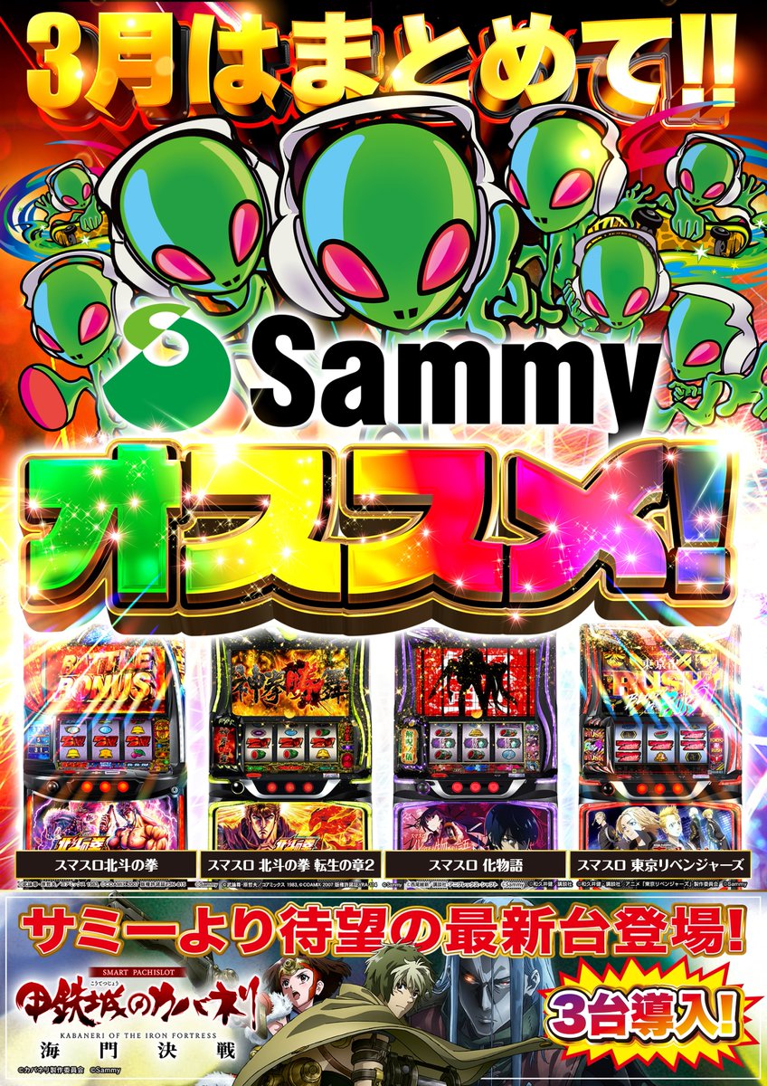 投稿本文: 明日3月16日(月)9:00オープン‼️🎊長泉千両丸 新台入替🎊✨サミーハッピーmonty✨3月はまとめて‼️🦒👽Sammyオススメ👽🦒長泉地区最大設置‼️スマスロ✨北斗の拳 転生の章2✨🤬東京喰種🤬絶賛稼働中⤴️⤴️⤴️皆様のご来店をお待ちしております🥰#長泉千両丸 さらに表示