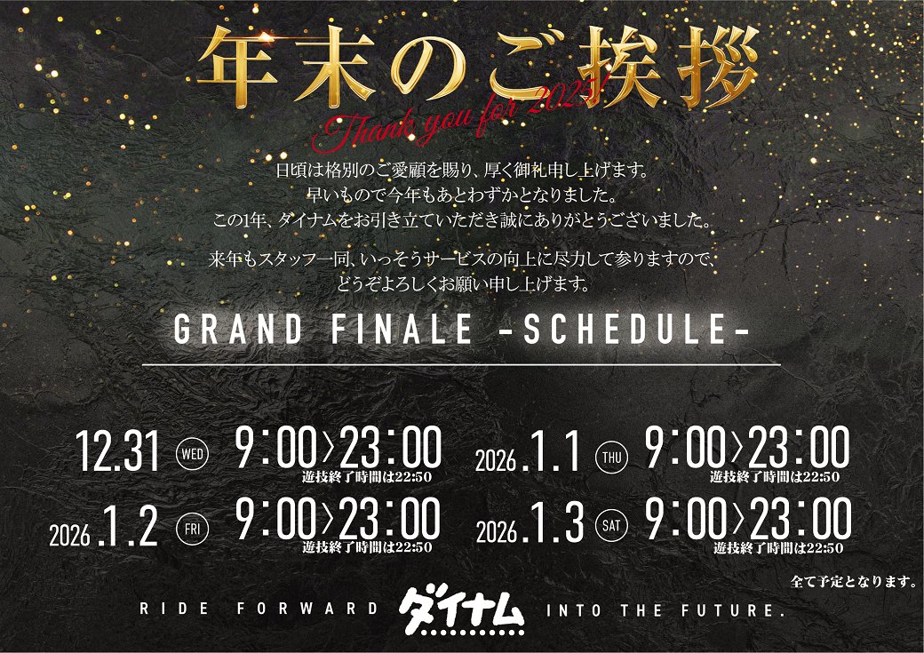 投稿本文: ~年末のご挨拶~本年もご多数様のご来店、誠にありがとうございました。これからも皆様に楽しんでいただけるよう、サービス向上に努めて参ります。2026年もダイナム山口宇部港町店をよろしくお願い致します。年末年始も休まず通常営業致します😄#ダイナム #宇部港町 #年末年始 さらに表示
