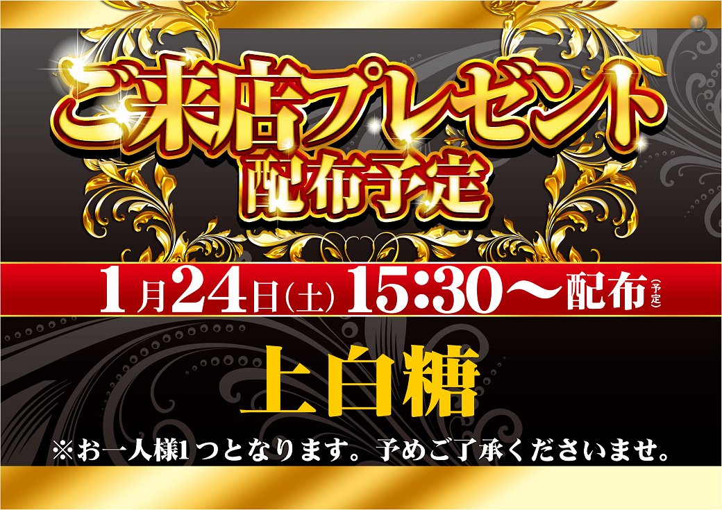 投稿本文: ダイナム古川店です😎明日1月24日(土)は🎁🎁ご来店プレゼント配布🎁🎁 🌟🌟🌟上白糖🌟🌟🌟15:30~の配付を予定致しております😆8:00開店(予定)です😊皆様のご来店お待ち致しております😍#ダイナム #大崎 #古川 さらに表示