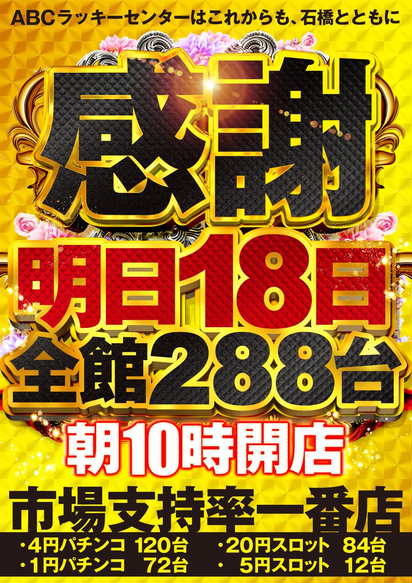 投稿本文: こんばんは🌜明日18日は石橋商店街のおはこ市✨ABCラッキーセンターも288台全館10時開店です🔥皆様のご来店お待ちしております😊 さらに表示