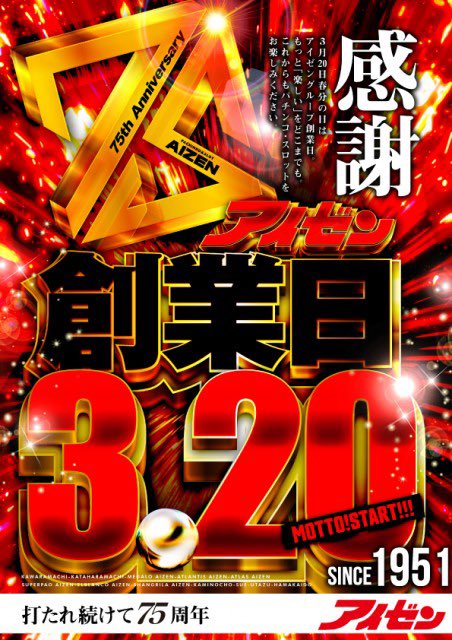 投稿本文: 3月20日(金)㊗️アイゼングループ75周年㊗️━━━━━━━━━━━━━━━━━・アトランティスアイゼン・メガロアイゼン・スーパーパオアイゼン・アイゼンはま街道店・アイゼン上之町店・アイゼン瓦町店・アイゼン片原町店・エルブランコ・アイゼン・アトラスアイゼン さらに表示