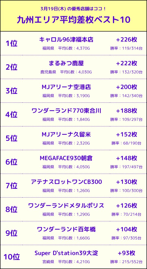 3/19 九州・沖縄 スロット平均差枚ランキング