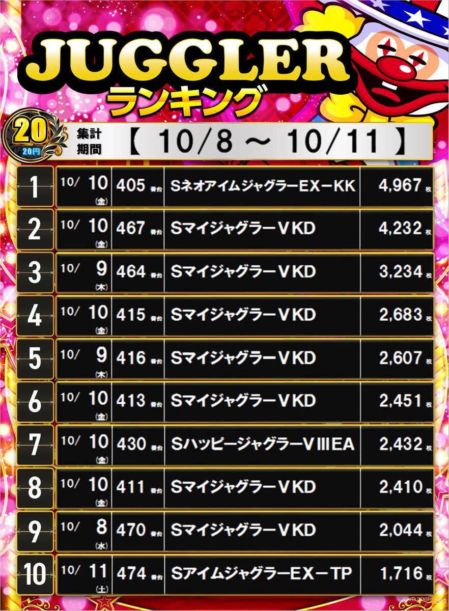 投稿本文: 🎰ジャグラー推しの皆様お待たせしました‼️#ネオアイムジャグラー 遂に増台✨5台増台、合計10台で日光市一番設置へ😁#スポーツの日 も、夜でも、毎日でも🎶もちろん #新台入替 も🔥打つならやっぱりダイナム栃木今市店へ👌☑ マイジャグラーVも10/8~14おすすめです😊#ダイナム さらに表示