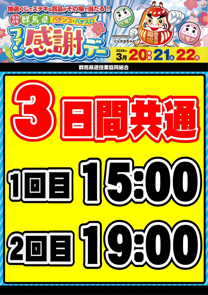 投稿本文: 3月20日(金)~22日(日) 💫群馬県 パチンコパチスロ 💫 💝 ファン感謝デー 💝 素敵な賞品がその場で当たる🎁 抽選時間は3日間共通 15:00 19:00 入場抽選は9:45~ 週末はぜひダイナム吉井店へ🚗 #ダイナム#ファン感 さらに表示