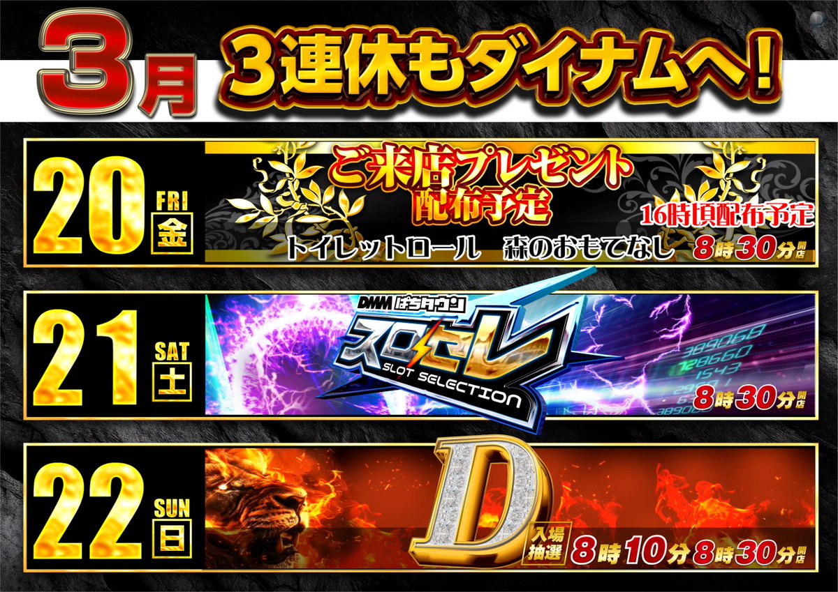 投稿本文: #ダイナム下田町店 です‼️#春分の日 ~の3連休はお近くのダイナムへ⭐20日 ご来店プレゼント⭐⭐21日スロセレは当店 【初・開・催】⭐⭐22日は入場抽選8:10分です⭐ さらに表示