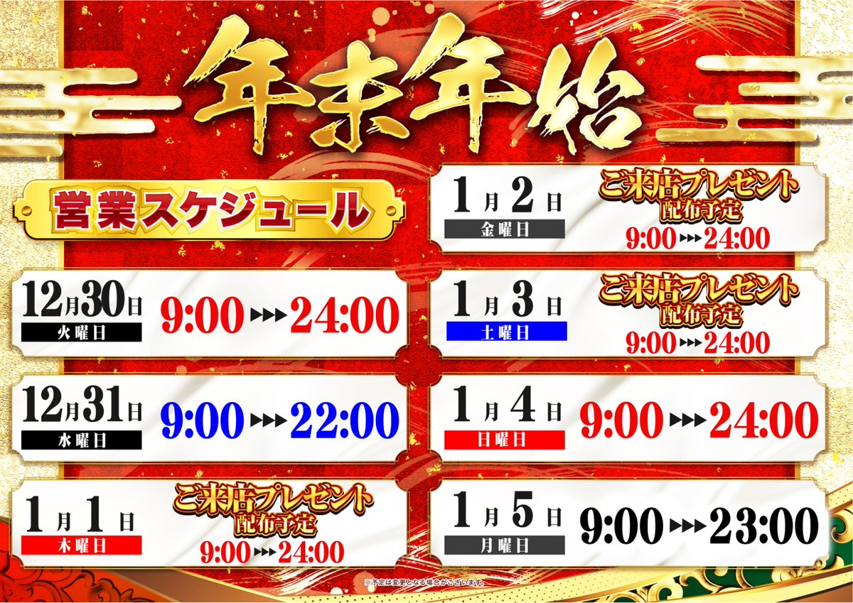 投稿本文: 本年もダイナム能代店をご愛顧頂き誠にありがとうございます😊年末年始の営業時間のご案内です↓💁♀️↓お正月三が日はご来店プレゼント配布予定しております!2026年も変わらぬご愛顧の程よろしくお願い申し上げます🙇ご来店お待ちしております!#ダイナム #お正月 さらに表示