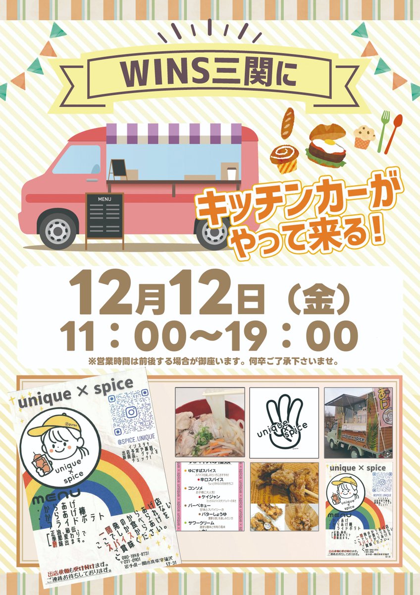 投稿本文: WINS三関店です(*'ω'*)ノ 本日は・・・WINS三関に・・【‼️キッチンカーがやって来る‼️】皆様お誘い合わせの上!是非!お試し下さいませ😍それでは本日はWINS三関店で ごゆっくりとお楽しみ下さい😊#パチンコ #スロット #一関 #uniquespice さらに表示