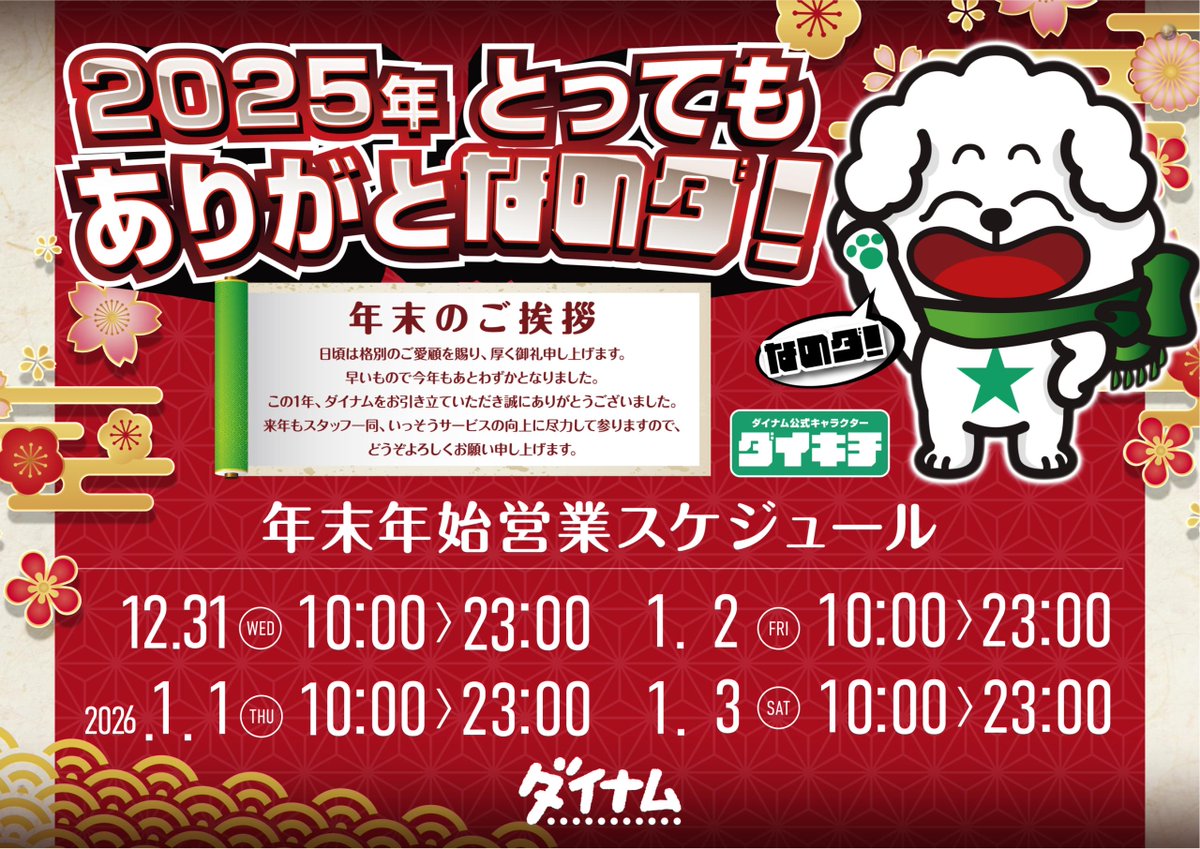 投稿本文: 2025年も残りわずかとなります。本年もダイナム奈良天理店をご愛顧いただき誠にありがとうございました。明日2026年1月1日も10:00より開店致します。新年初打ちも是非当店でお楽しみください。それでは良いお年をお迎えくださいませ。#ダイナム #年末のご挨拶 さらに表示