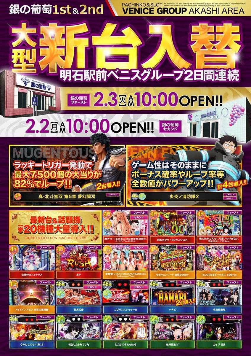 投稿本文: こんばんは🌙銀の葡萄セカンドです☺️明日2️⃣月2️⃣日(月)✨最新台最速稼働‼️✨5️⃣機種6️⃣台低貸にて最速解禁💥🔥🔥🔥🔥🔥🔥炎炎ノ消防隊2明石駅前低貸2️⃣台導入‼️🔥🔥🔥🔥🔥🔥低貸で最新台を遊びつくそう♪ 皆様のご来店お待ちしております⛄️✨ さらに表示