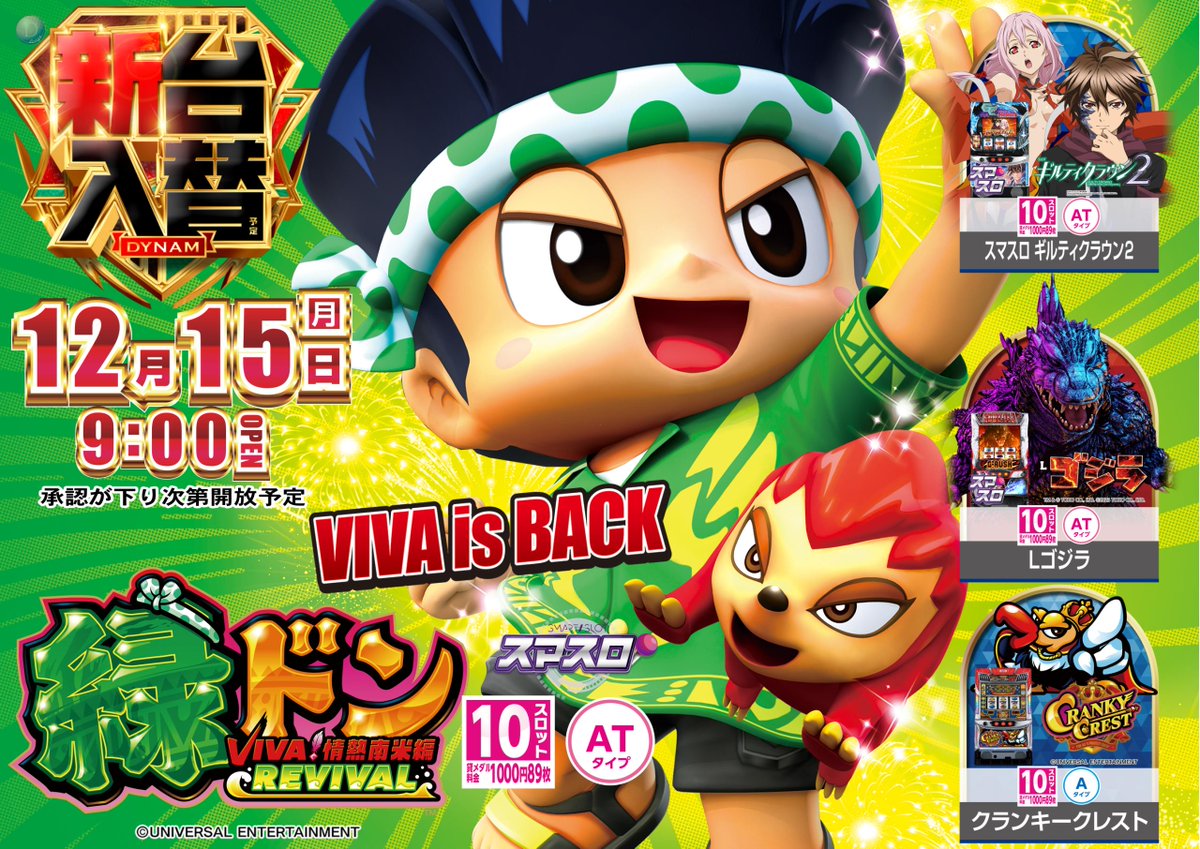 投稿本文: こんにちは☀️ダイナム新発田加治店です😌来週12月15日(月)🌙🌟新台入替🌟パチンコ🐠スーパー海物語IN沖縄5夜桜趙旋風99verスロット🎰緑ドンギルティクラウン2ゴジラクランキークレスト5機種8台の導入を予定しています💫#ダイナム #新台入替 #海物語 #ドンちゃん さらに表示