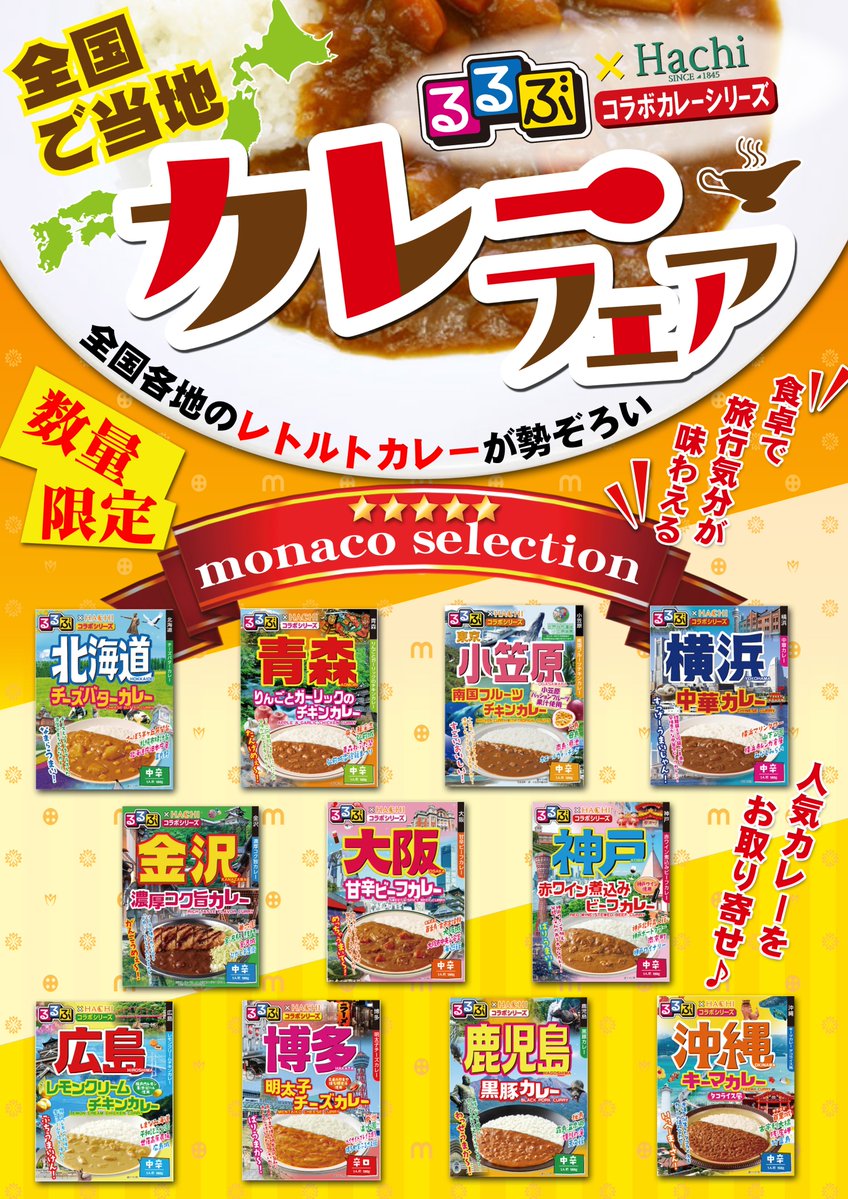 投稿本文: おはようございます😁モナコリゾート店長の橋本です!本日12月15日より 開催致します! 🍛るるぶ×Hachiコラボシリーズ🍛 🗾🗾全国ご当地🗾🗾 🍛🍛カレーフェア🍛🍛 🌟ご紹介します🌟全国のご当地カレー商品を入荷しました!どれも厳選して取り揃えていますが、 さらに表示