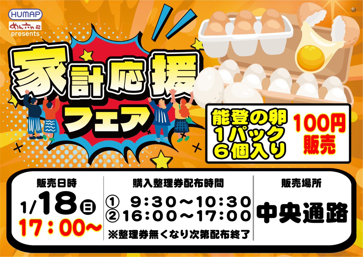 投稿本文: こんばんは😄ダイナム福岡柳川店からお知らせです❗明日1月18日(日)は🥚家計応援フェア開催🥚【能登の卵】1パック6個入りが100円‼️⏲️整理券配布① 9:30~10:30②16:00~17:00※券無くなり次第配布終了🔔販売開始【17:00】ご来店お待ちしております‼️ さらに表示