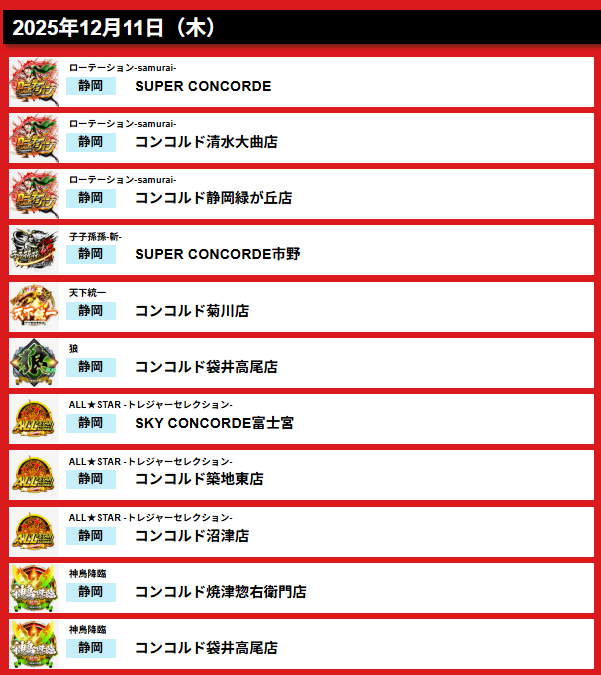 投稿本文: 12/11PU(画像は一部)【気になる】※楽園系列※アプリイ系列※YUMEYA浜松大柳※新甲子園◆コンコルド島田駅前 ⇒SSヒカルくん取材◆ABC伊東吉田 ⇒SLO DAMONDE◆ABC御殿場川島田 ⇒総力取材BUZZ SLOT◆ABC清水町長沢店 ⇒いそまる来店◆YUMEYA浜松大柳 ⇒創業CHARGE突撃取材 さらに表示