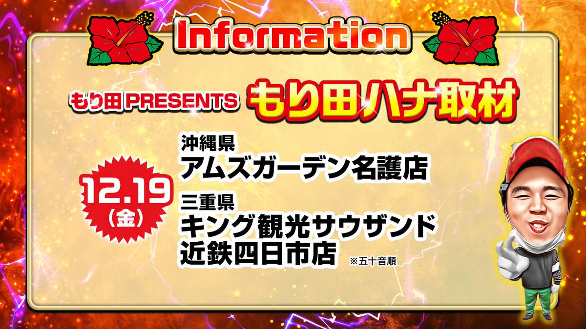 投稿本文: /🌺もり田PRESENTSもり田ハナ取材🗒️🌺開催告知\12月19日(金) 沖縄県・三重県の2店舗でもり田ハナ取材を開催いたします🔥🔥【アムズガーデン名護店】沖縄県ハナハナ総台数🌺計74台取材対応時間⏰8:30~9:30ごろ【キング観光サウザンド近鉄四日市店】三重県ハナハナ総台数🌺計63台 さらに表示