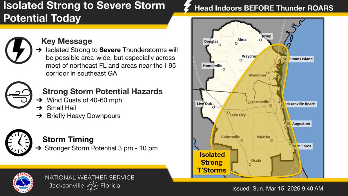 ⚠️Isolated strong to severe t'storms possible today ⛈️ for NE FL & near the I-95 corridor into SE GA