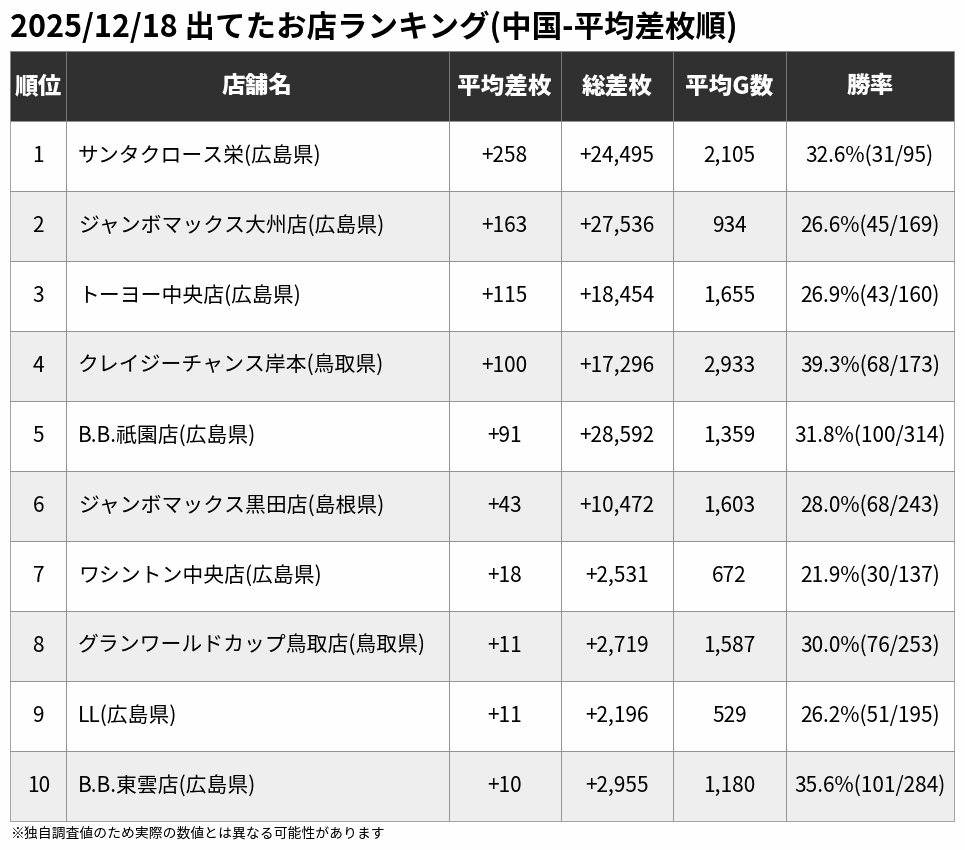🏆12/18 出てたお店ランキング(中国-平均差枚順)