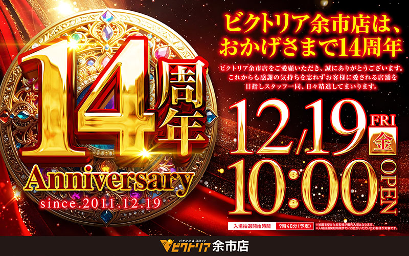 投稿本文: おはようございます✨本日、12月19日(金)ビクトリア余市店は14周年を迎えました。今後もご愛顧の程、よろしくお願い申し上げます。開店時間【 午前10時 】入場抽選 9時40分皆様のご来店お待ちしております‼️ さらに表示