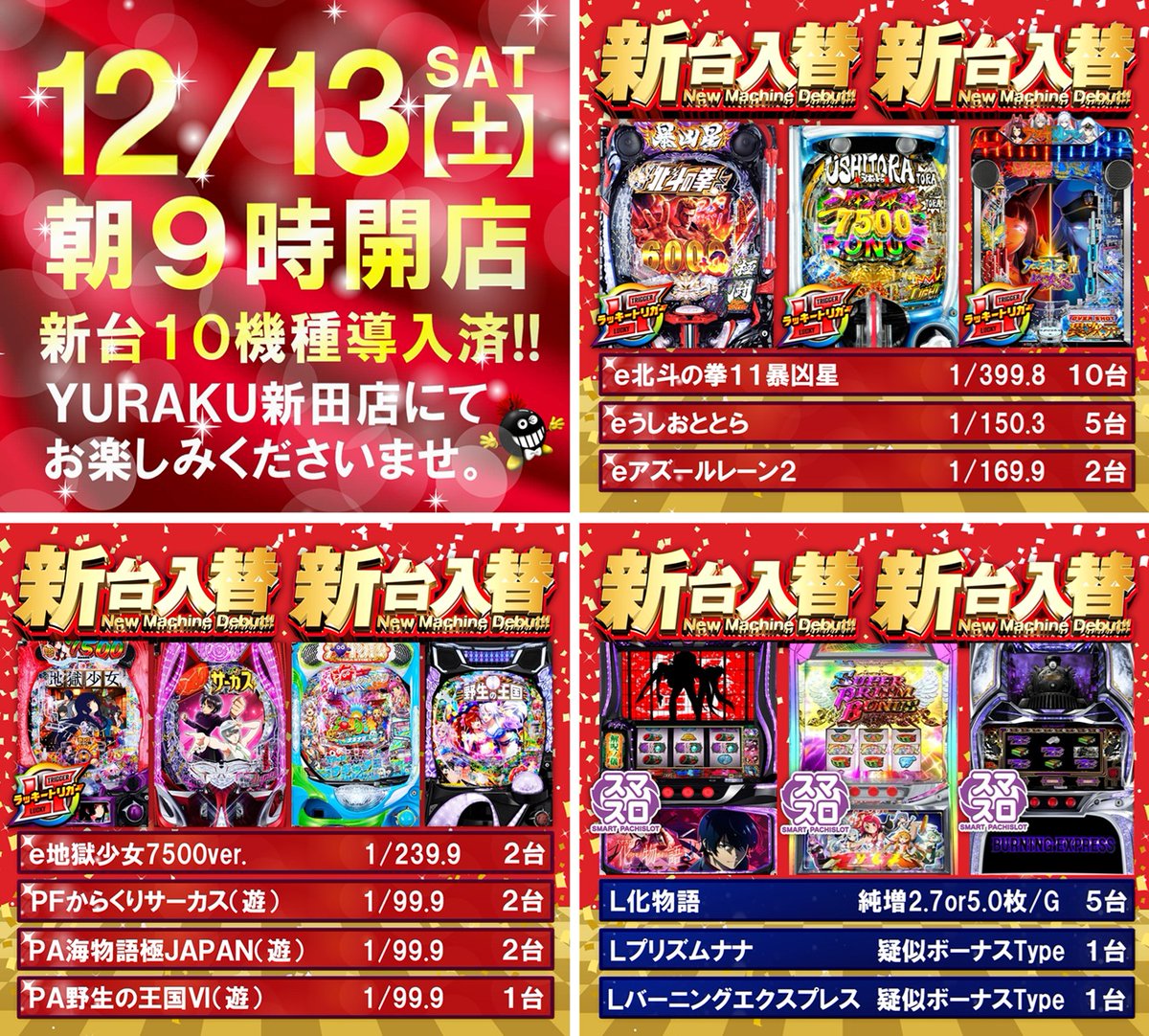 投稿本文: 12月13日【土】9時開店✨今週は最新機種10機種導入!!週末も有楽新田店にてお楽しみください😊#有楽新田店 さらに表示