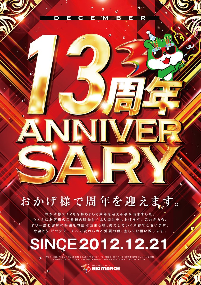 投稿本文: こんばんは🌟明日12月21日(日)はビックマーチ河和田東店13周年🎊🎊🎊明日も朝9:00オープン!!抽選は朝8:30より開始☀️🕣皆様のご来店をスタッフ一同心よりお待ちしております!☺️✨#ビックマーチ河和田東店 #ビックマーチ #河和田東店 #12周年 さらに表示