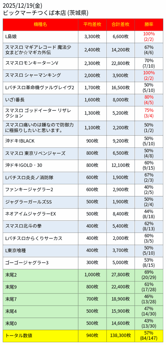 投稿本文: #スロット結果データ📈~茨城県~12月19日(金)🔥ビックマーチつくば本店※9の付く日👑機種TOP3🥇島娘🥈マギアレコードまどマギ外伝🥉モンキーターンV📝総差枚+94,100枚✨平均差枚+320枚✨全台系.1/2&1/3機種.並び.単品勝率:46.4%(135/291) さらに表示
