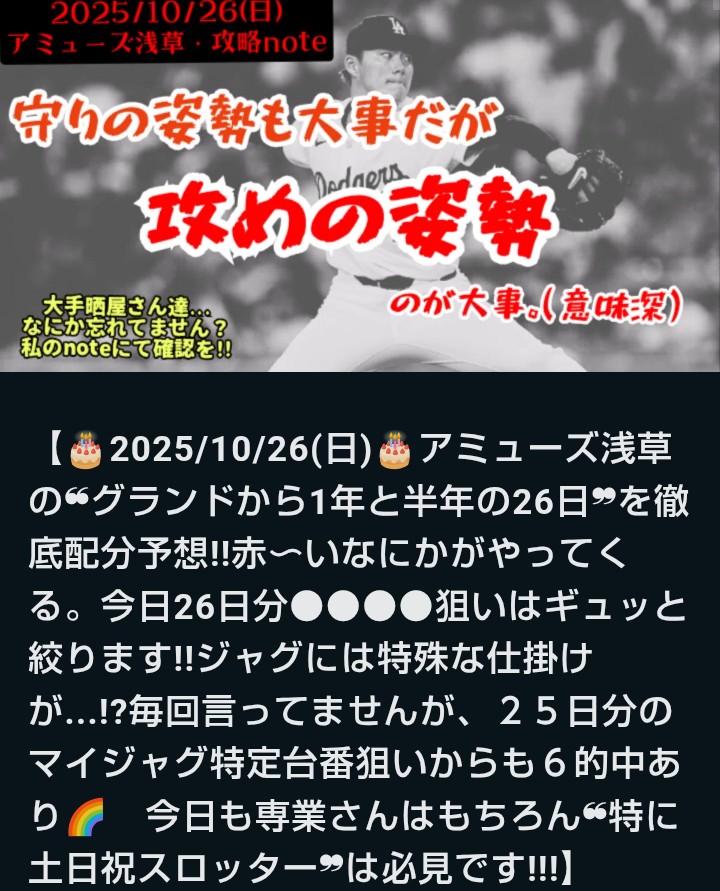 投稿本文: 【マルハン池袋SLOT BASE】2025/10/26(日)スロットデータ【高設定機種予想】|設定大好き!シゴロちゃん🎲 @ajyarakamokuba https://note.com/slot_456chan/n/n8edb4b0b470f?sub_rt=share_sb さらに表示