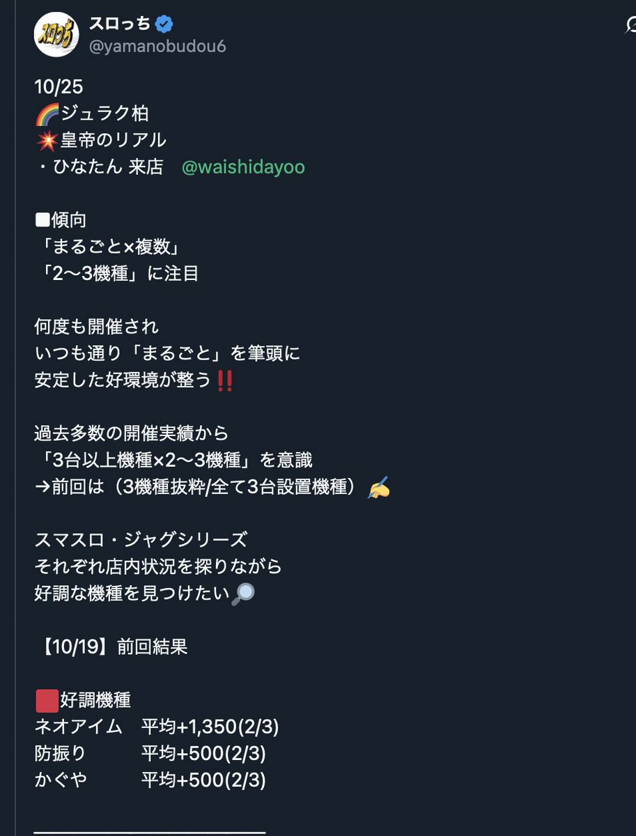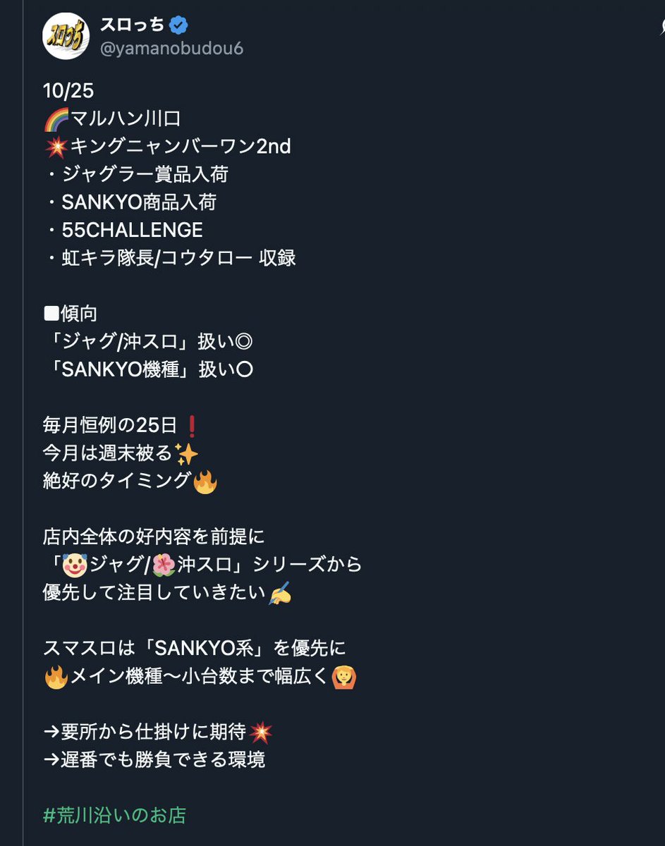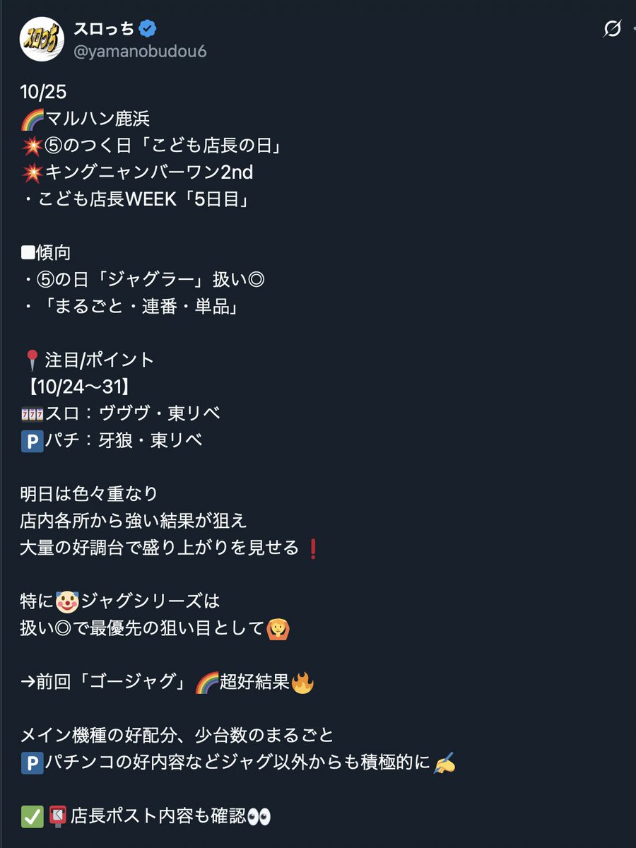 投稿本文: マルハン鹿浜店】2025/10/25(土)スロットデータ【高設定機種予想】|設定大好き!シゴロちゃん🎲 @ajyarakamokuba https://note.com/slot_456chan/n/n8eb3d4a96ce5?sub_rt=share_pb さらに表示