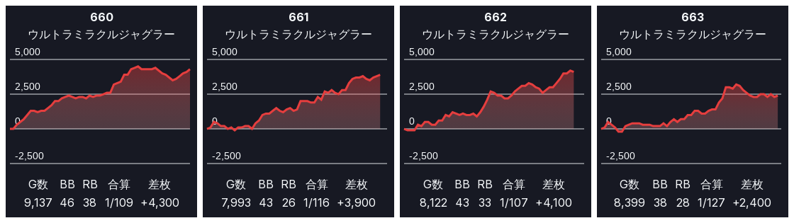 4台機種の「ウルトラミラクルジャグラー」の全系を筆頭にこの日は4台並びが大量に用意されていた